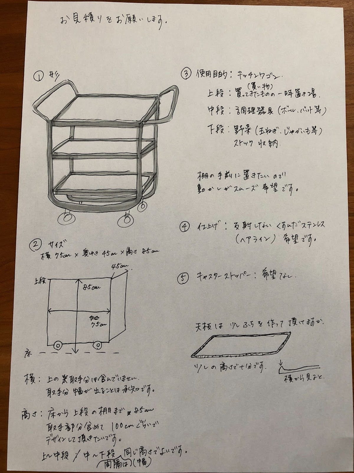 もともと市販のキッチンワゴンを探されていたそうですが、「これだ」と思える形に出会えず、オーダーメイドという選択肢にたどり着かれました。インターネットで特注製作を調べる中で、弊社にご相談いただきました。