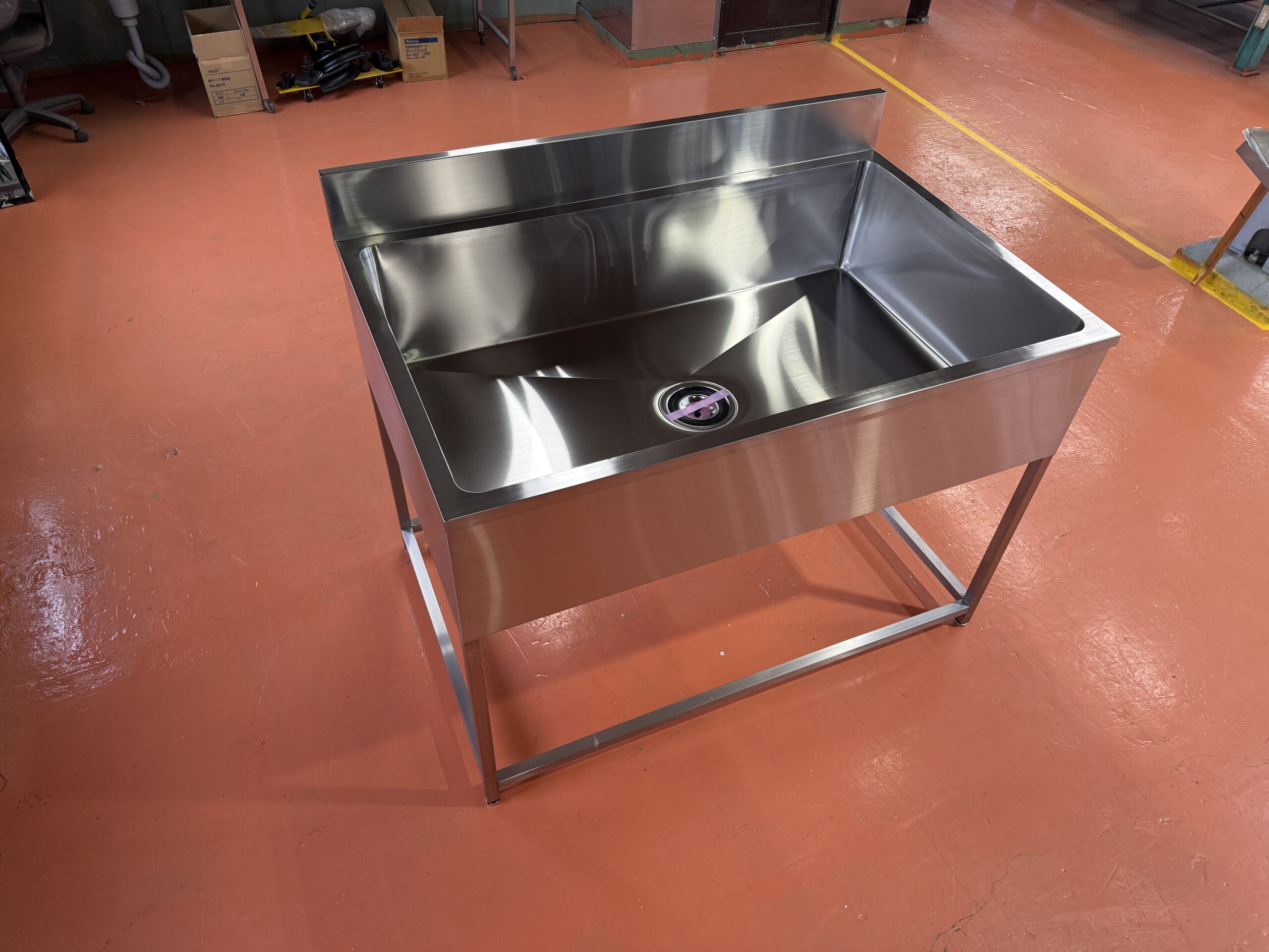 プラスチック製品の水研ぎ作業用として製作した、大型一槽シンクのオーダー事例です。
