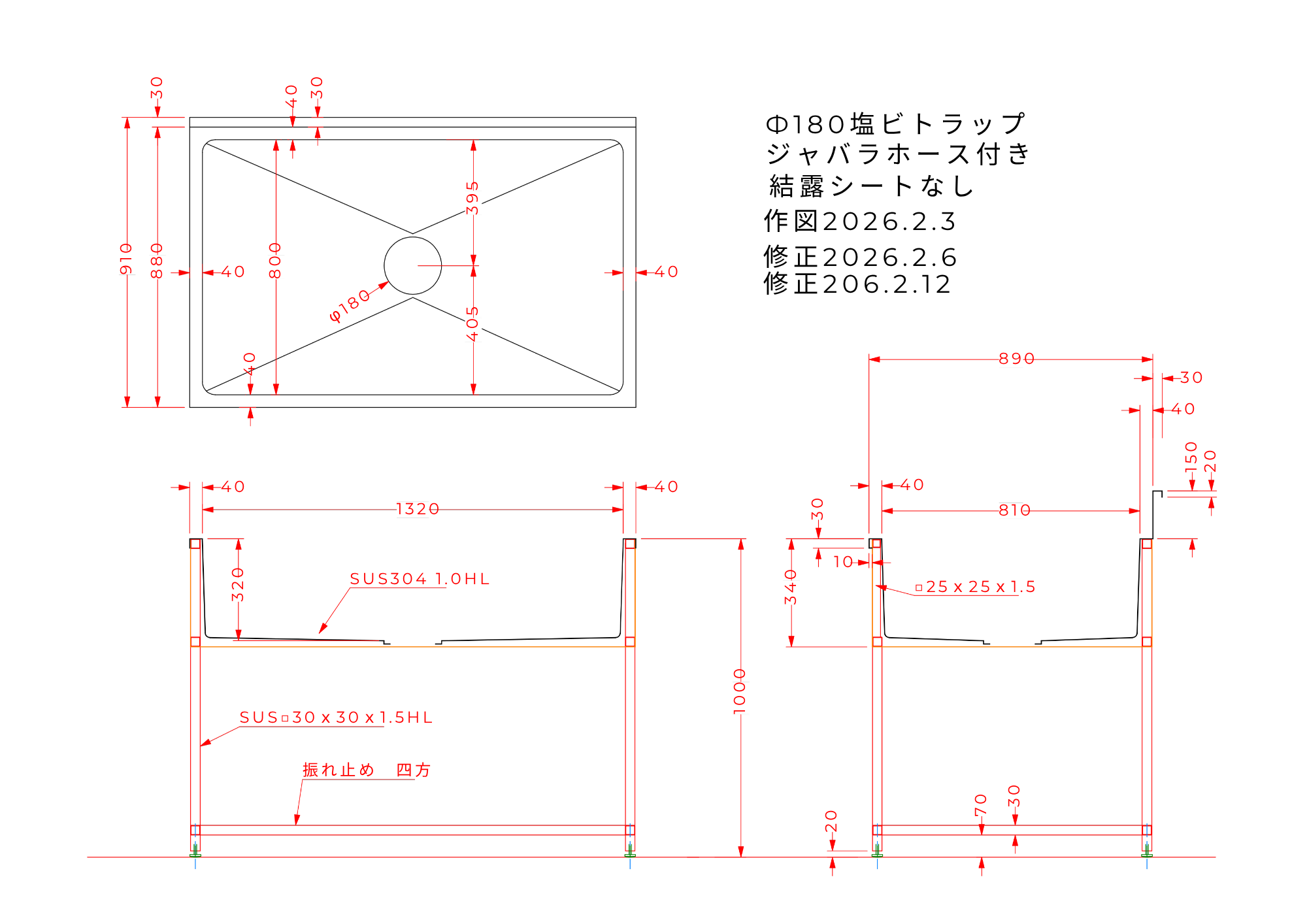 本体はSUS304を使用し、水や研磨による負荷にも強く、耐久性・耐食性に優れています。脚部は角パイプでしっかりとした強度を確保し、全体高さは1000mmで作業しやすい設計としています。